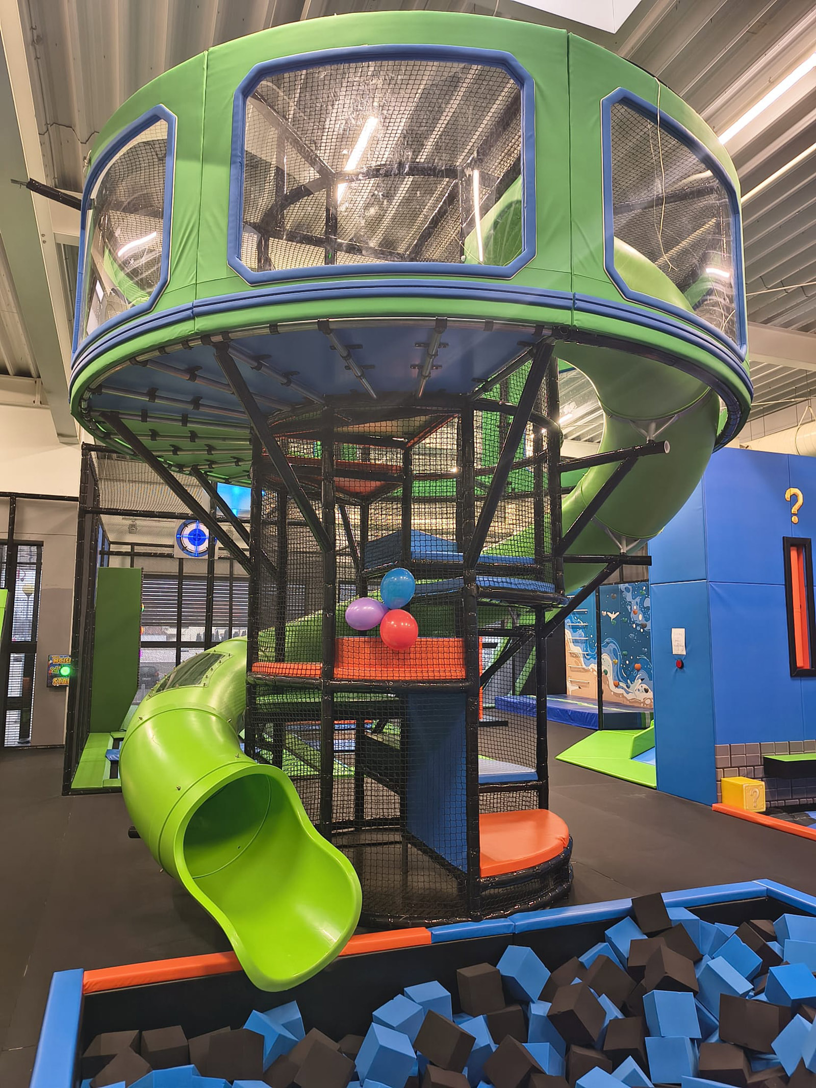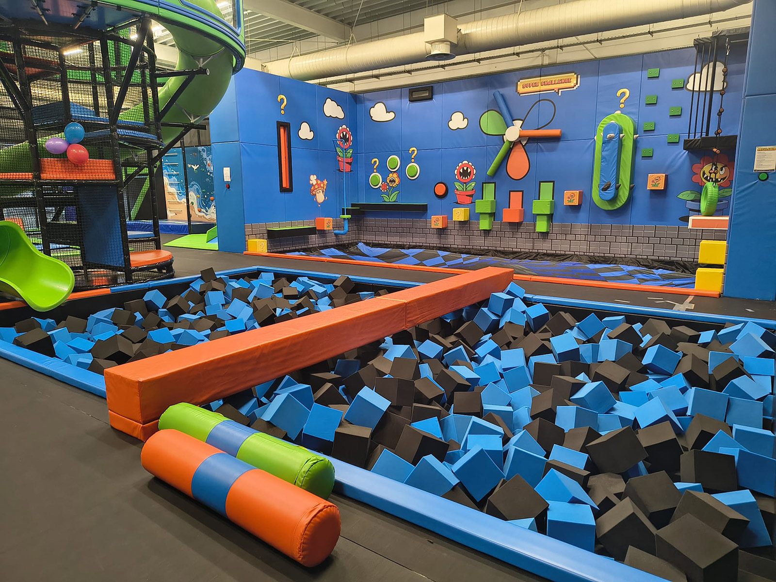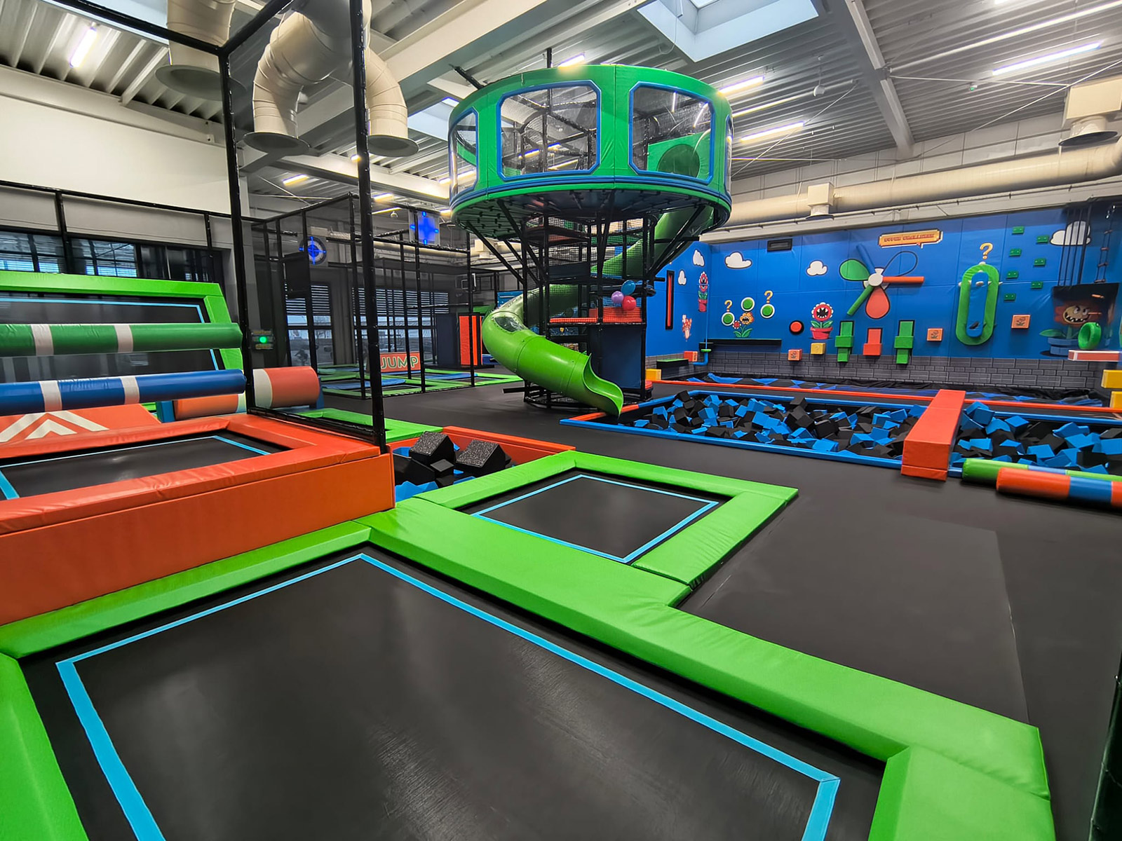 - Trampoliny sportowe - Tory Ninja - Ścianka Pająka - Ścianka wspinaczkowa - Basen z gąbkami - Pomost łączący sale ze zjeżdżalnią