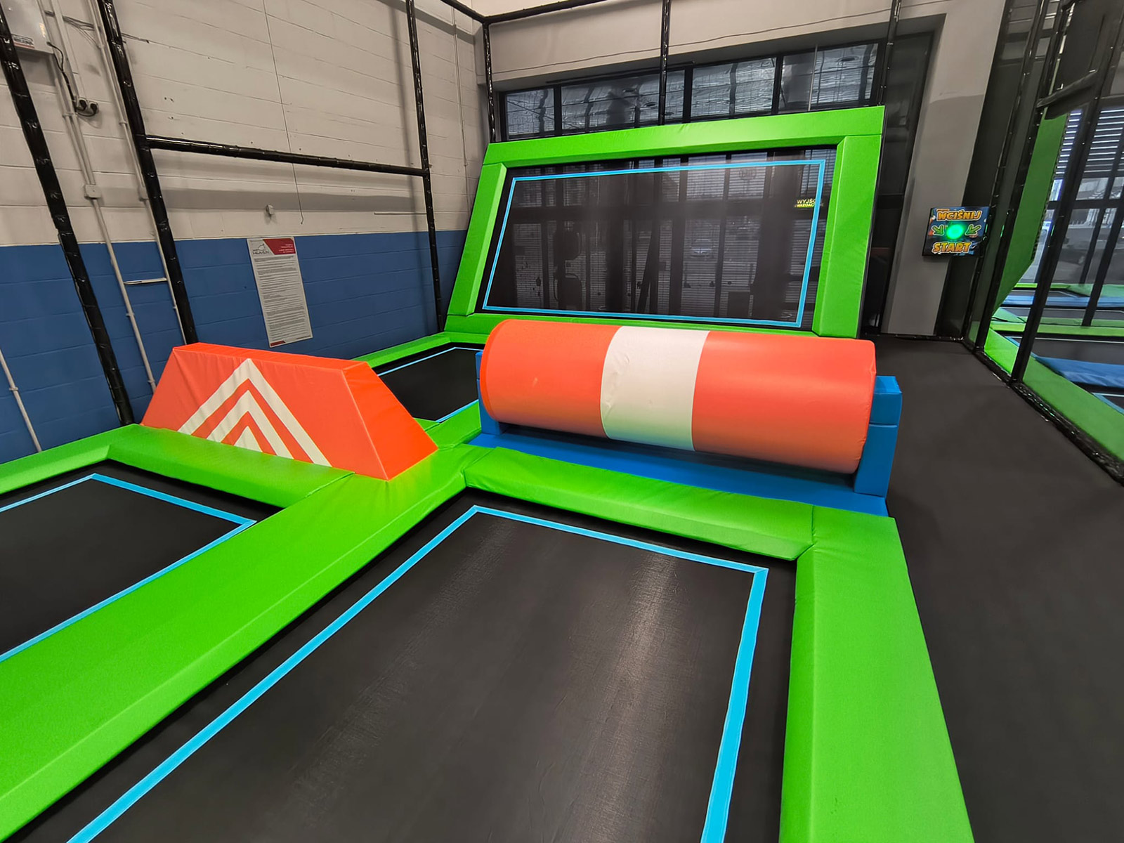 - Trampoliny sportowe - Tory Ninja - Ścianka wspinaczkowa - Basen z gąbkami - Zjeżdżalnia pontonowa z igielitu